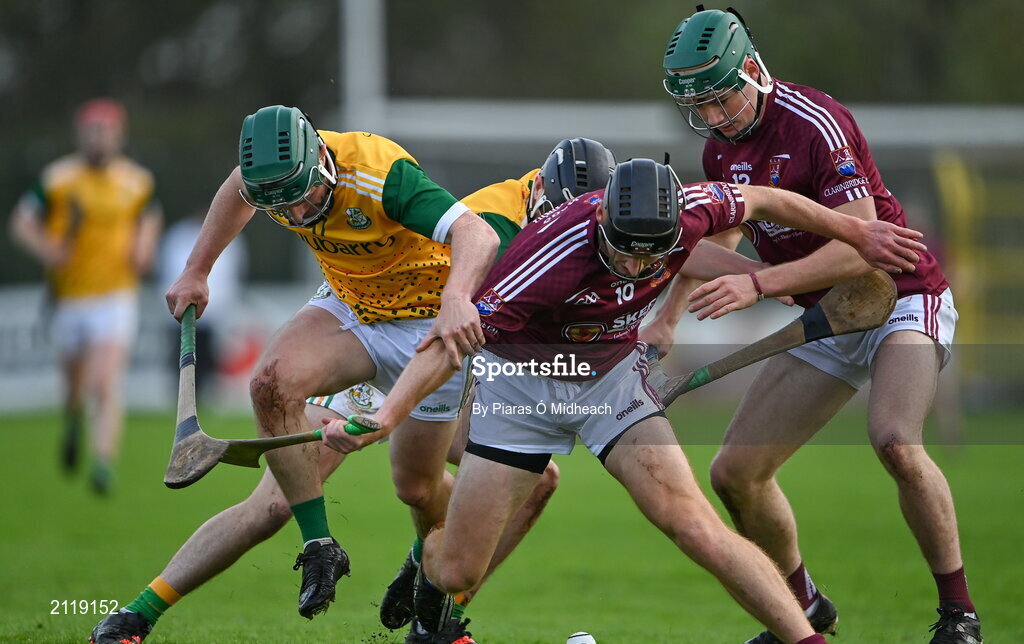 6 November 2021; Clarinbridge players Mikey Daly, left, and Mark Kennedy in action against Craughwell players Mark Monaghan, left, and Thomas Hynes during the Galway County Senior Club Hurling Championship semi-final match between Craughwell and Clarinbridge at Kenny Park in Athenry, Galway. Photo by Piaras Ó Mídheach/Sportsfile