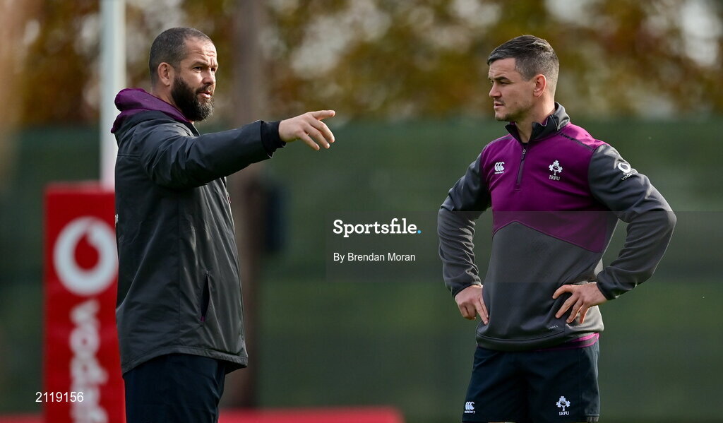10 November 2021; Head coach Andy Farrell, left, and Jonathan Sexton during Ireland rugby squad training at Carton House in Maynooth, Kildare. Photo by Brendan Moran/Sportsfile