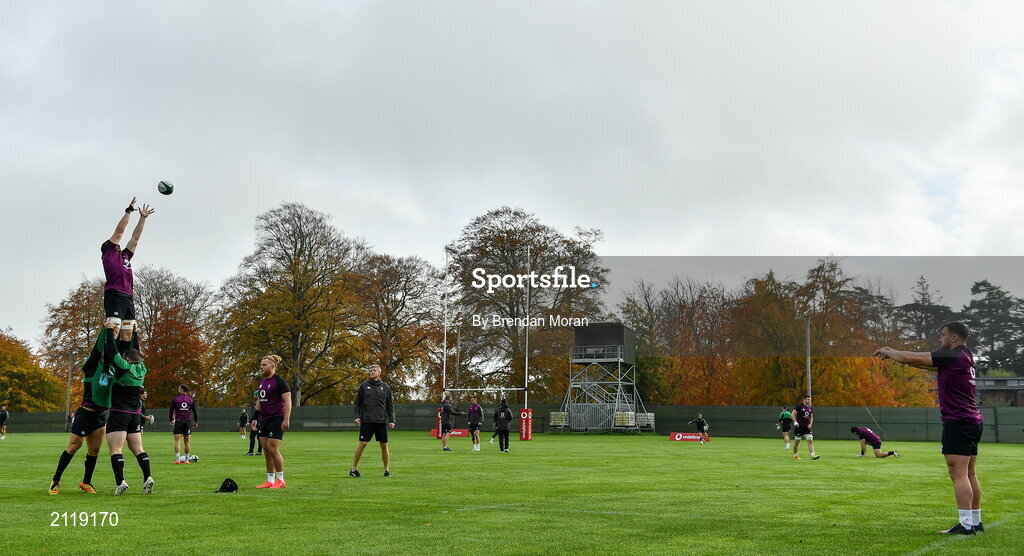 10 November 2021; Ronán Kelleher practices his lineout throwing with Jack Conan during Ireland rugby squad training at Carton House in Maynooth, Kildare. Photo by Brendan Moran/Sportsfile