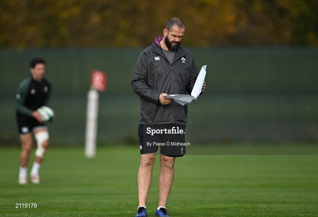 10 November 2021; Head coach Andy Farrell reads his notes during Ireland rugby squad training at Carton House in Maynooth, Kildare. Photo by Piaras Ó Mídheach/Sportsfile