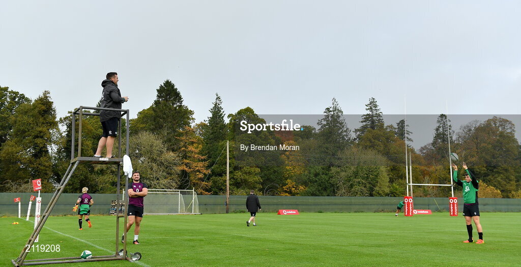 10 November 2021; Dan Sheehan practices his lineout throwing with national scrum coach John Fogarty during Ireland rugby squad training at Carton House in Maynooth, Kildare. Photo by Brendan Moran/Sportsfile