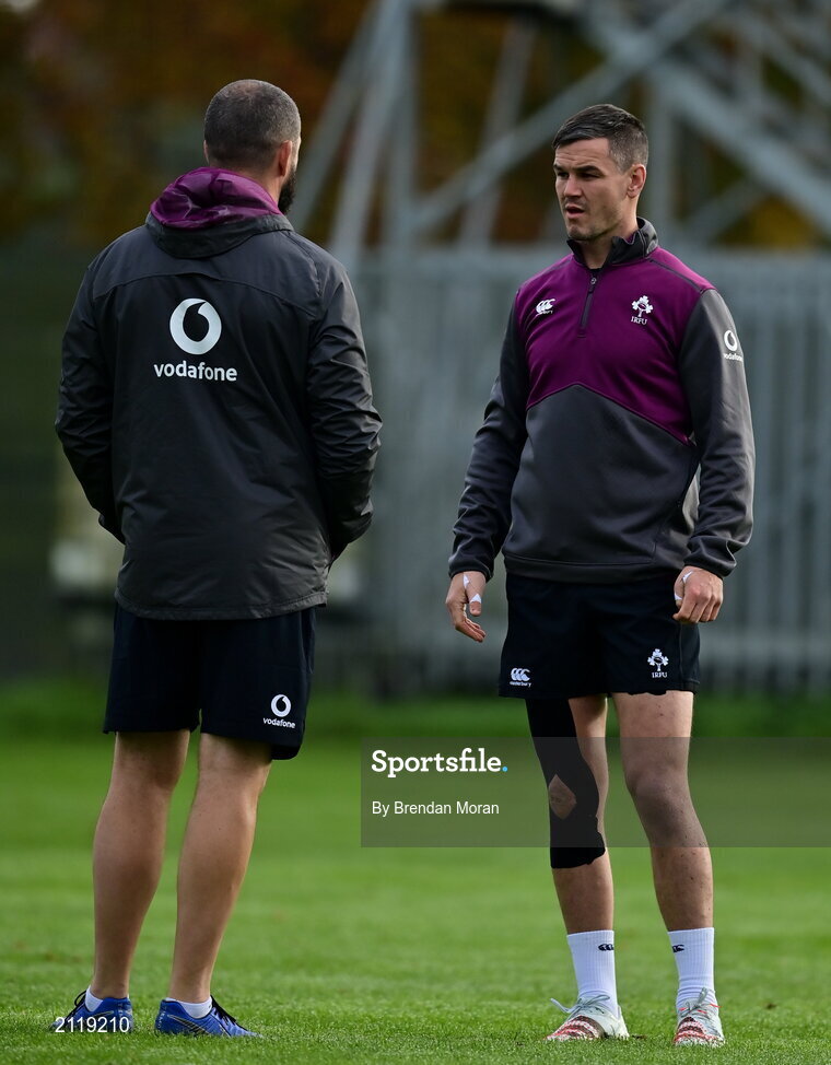 10 November 2021; Jonathan Sexton, right, with head coach Andy Farrell during Ireland rugby squad training at Carton House in Maynooth, Kildare. Photo by Brendan Moran/Sportsfile