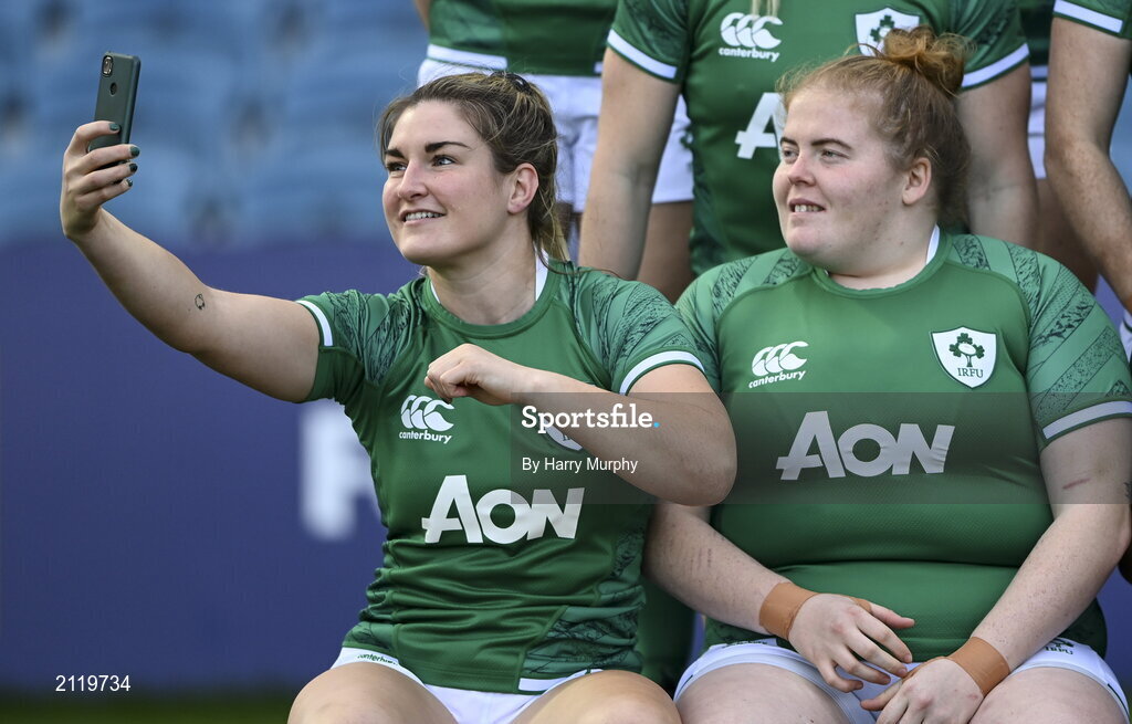 11 November 2021; Anna Caplice, left, takes a selfie with Leah Lyons before the Ireland women's captain's run at RDS Arena in Dublin. Photo by Harry Murphy/Sportsfile