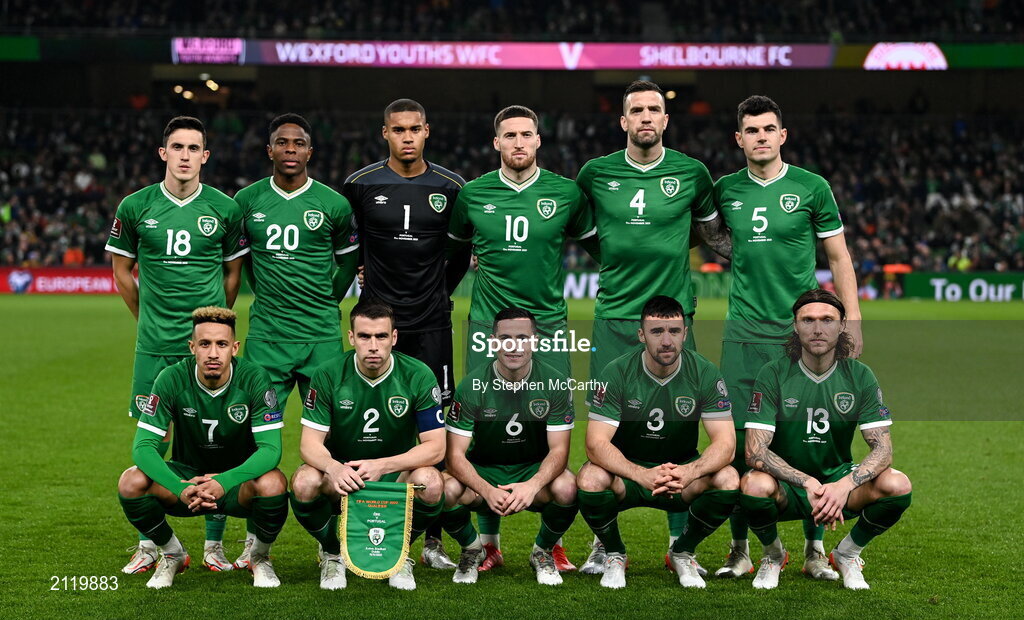 11 November 2021; The Republic of Ireland team, back row, from left, Jamie McGrath, Chiedozie Ogbene, Gavin Bazunu, Matt Doherty, Shane Duffy and John Egan with front, from left, Callum Robinson, Seamus Coleman, Josh Cullen, Enda Stevens and Jeff Hendrick before the FIFA World Cup 2022 qualifying group A match between Republic of Ireland and Portugal at the Aviva Stadium in Dublin. Photo by Stephen McCarthy/Sportsfile
