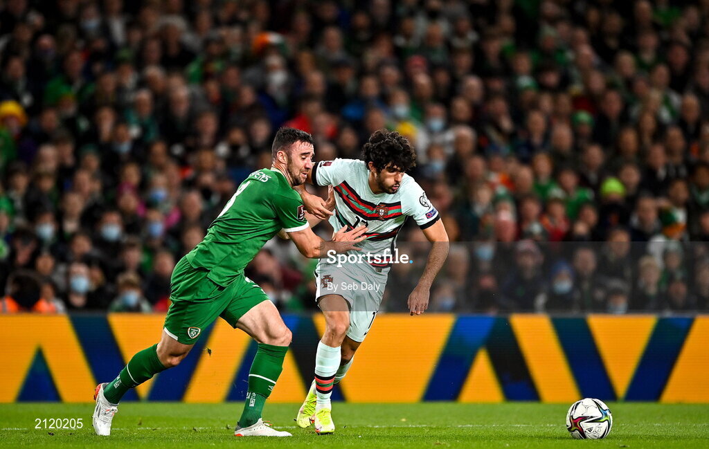 11 November 2021; Goncalo Guedes of Portugal in action against Enda Stevens of Republic of Ireland during the FIFA World Cup 2022 qualifying group A match between Republic of Ireland and Portugal at the Aviva Stadium in Dublin. Photo by Seb Daly/Sportsfile