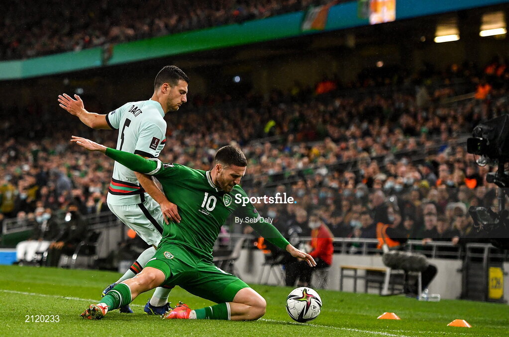 11 November 2021; Matt Doherty of Republic of Ireland in action against Diogo Dalot of Portugal during the FIFA World Cup 2022 qualifying group A match between Republic of Ireland and Portugal at the Aviva Stadium in Dublin. Photo by Seb Daly/Sportsfile