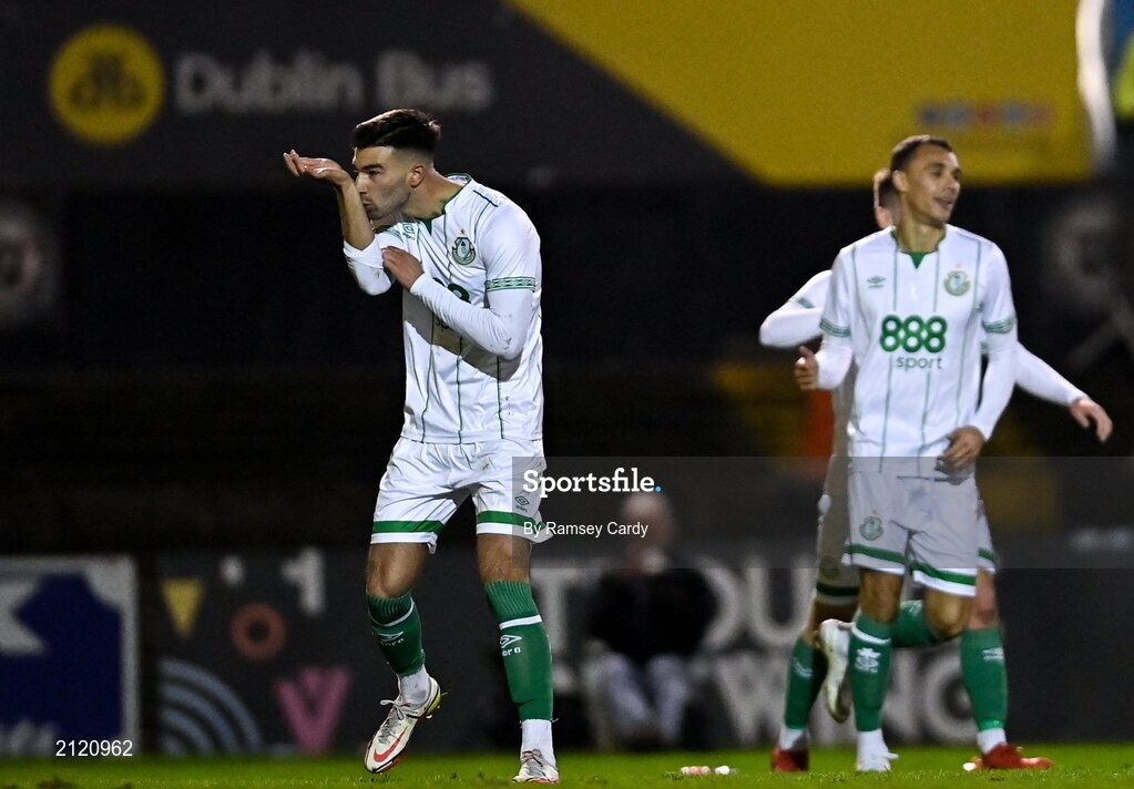 12 November 2021; Danny Mandroiu of Shamrock Rovers celebrates after scoring his side's first goal during the SSE Airtricity League Premier Division match between Bohemians and Shamrock Rovers at Dalymount Park in Dublin. Photo by Ramsey Cardy/Sportsfile
