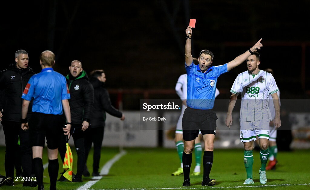 12 November 2021; Referee Paul McLaughlin shows a red card to Bohemians manager Keith Long, not pictured, during the SSE Airtricity League Premier Division match between Bohemians and Shamrock Rovers at Dalymount Park in Dublin. Photo by Seb Daly/Sportsfile