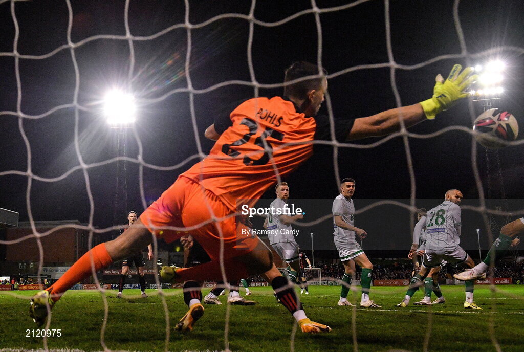 12 November 2021; Shamrock Rovers goalkeeper Leon Pohls fails to stop a goal by Rob Cornwall of Bohemians during the SSE Airtricity League Premier Division match between Bohemians and Shamrock Rovers at Dalymount Park in Dublin. Photo by Ramsey Cardy/Sportsfile