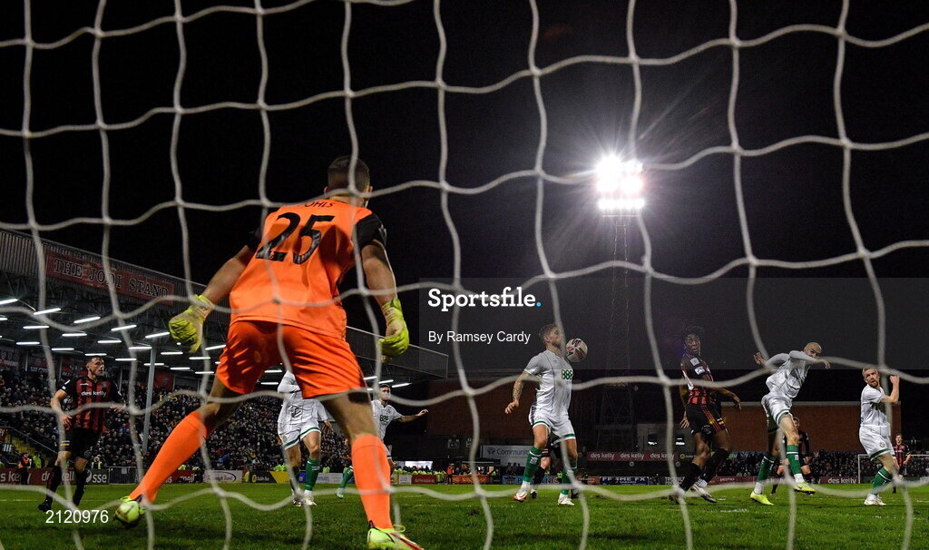 12 November 2021; Lee Grace of Shamrock Rovers scores an own goal during the SSE Airtricity League Premier Division match between Bohemians and Shamrock Rovers at Dalymount Park in Dublin. Photo by Ramsey Cardy/Sportsfile