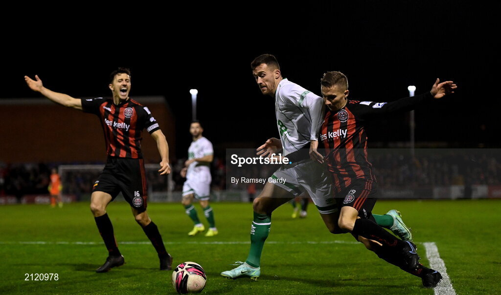 12 November 2021; Aaron Greene of Shamrock Rovers in action against Tyreke Wilson of Bohemians during the SSE Airtricity League Premier Division match between Bohemians and Shamrock Rovers at Dalymount Park in Dublin. Photo by Ramsey Cardy/Sportsfile