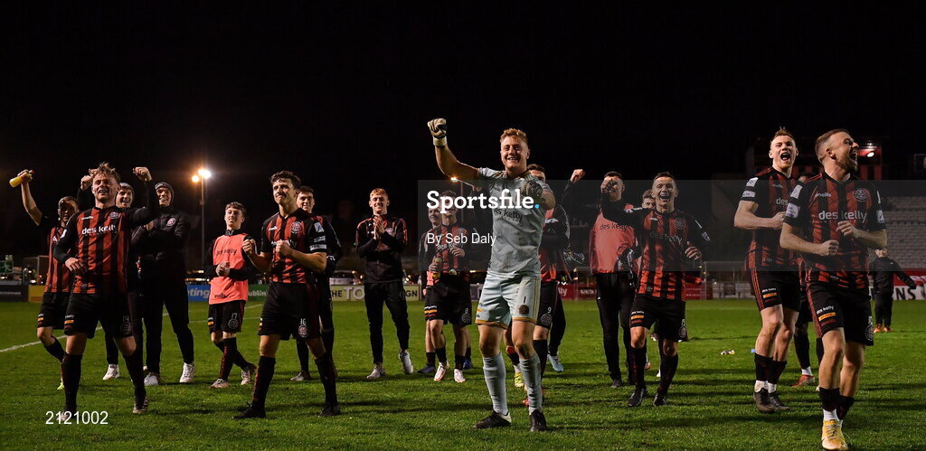 12 November 2021; Bohemians goalkeeper James Talbot, centre, leads his team-mates in celebration after their side's victory the SSE Airtricity League Premier Division match between Bohemians and Shamrock Rovers at Dalymount Park in Dublin. Photo by Seb Daly/Sportsfile