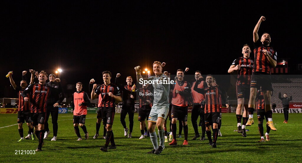12 November 2021; Bohemians goalkeeper James Talbot, centre, leads his team-mates in celebration after their side's victory the SSE Airtricity League Premier Division match between Bohemians and Shamrock Rovers at Dalymount Park in Dublin. Photo by Seb Daly/Sportsfile