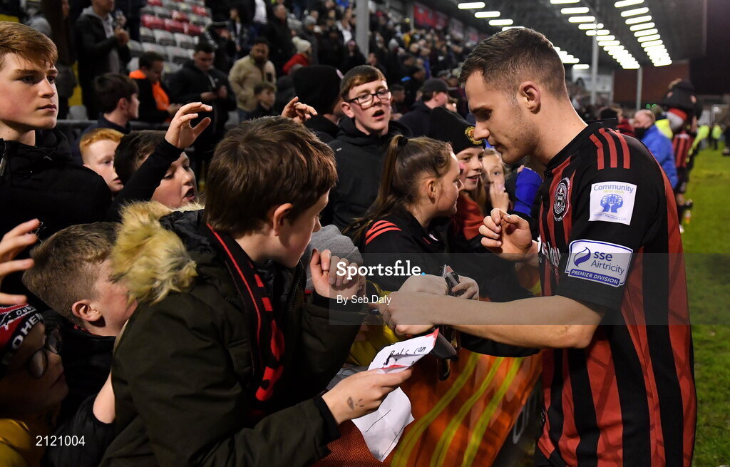 12 November 2021; Liam Burt of Bohemians signs autographs for supporters after the SSE Airtricity League Premier Division match between Bohemians and Shamrock Rovers at Dalymount Park in Dublin. Photo by Seb Daly/Sportsfile