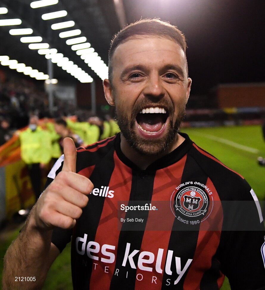 12 November 2021; Keith Ward of Bohemians celebrates after his side's victory in the SSE Airtricity League Premier Division match between Bohemians and Shamrock Rovers at Dalymount Park in Dublin. Photo by Seb Daly/Sportsfile