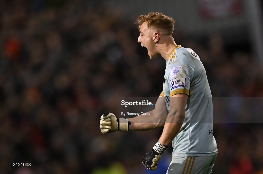 12 November 2021; Bohemians goalkeeper James Talbot celebrates after the SSE Airtricity League Premier Division match between Bohemians and Shamrock Rovers at Dalymount Park in Dublin. Photo by Ramsey Cardy/Sportsfile