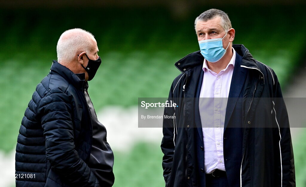 12 November 2021; Ireland team manager Michael Kearney, left, and IRFU chief executive Philip Browne during Ireland captain's run at Aviva Stadium in Dublin. Photo by Brendan Moran/Sportsfile