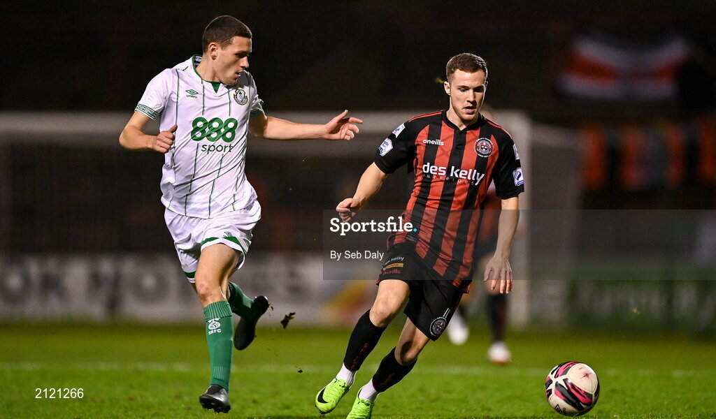 12 November 2021; Liam Burt of Bohemians in action against Max Murphy of Shamrock Rovers during the SSE Airtricity League Premier Division match between Bohemians and Shamrock Rovers at Dalymount Park in Dublin. Photo by Seb Daly/Sportsfile