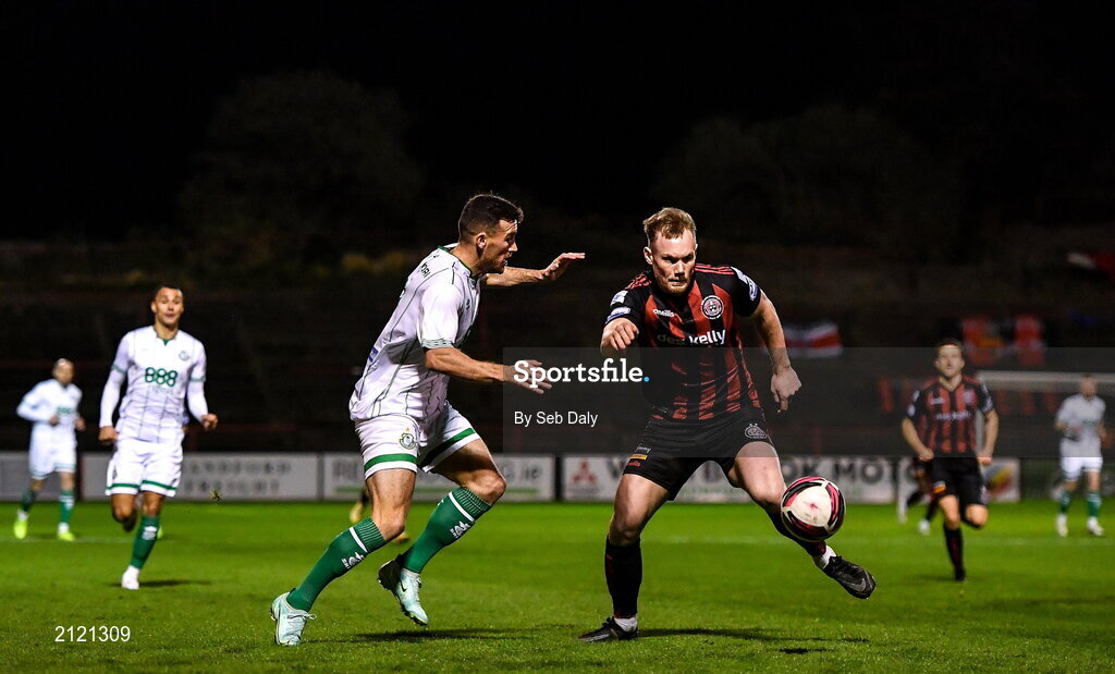 12 November 2021; Ciarán Kelly of Bohemians in action against Aaron Greene of Shamrock Rovers during the SSE Airtricity League Premier Division match between Bohemians and Shamrock Rovers at Dalymount Park in Dublin. Photo by Seb Daly/Sportsfile
