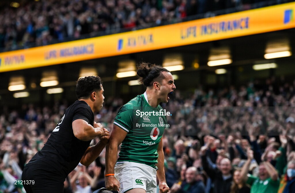 13 November 2021; James Lowe of Ireland celebrates after scoring his side's first try during the Autumn Nations Series match between Ireland and New Zealand at Aviva Stadium in Dublin. Photo by Brendan Moran/Sportsfile