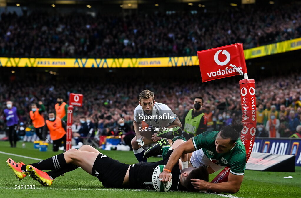 13 November 2021; James Lowe of Ireland dives over to score his side's first try despite the tackle of Jordie Barrett of New Zealand during the Autumn Nations Series match between Ireland and New Zealand at Aviva Stadium in Dublin. Photo by Brendan Moran/Sportsfile
