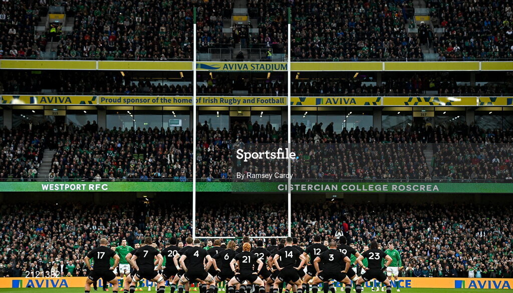 13 November 2021; New Zealand players perform the Haka before the Autumn Nations Series match between Ireland and New Zealand at Aviva Stadium in Dublin. Photo by Ramsey Cardy/Sportsfile
