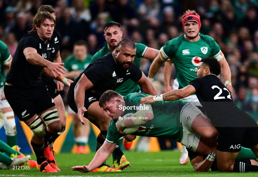 13 November 2021; Tadhg Furlong of Ireland scores his side's second try which is subsequently disallowed during the Autumn Nations Series match between Ireland and New Zealand at Aviva Stadium in Dublin. Photo by Brendan Moran/Sportsfile
