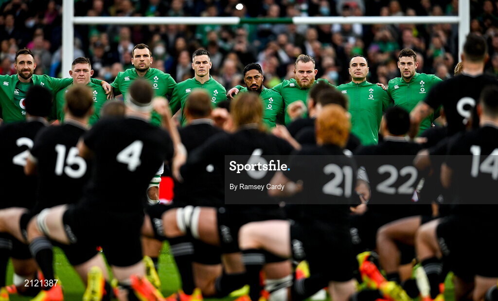 13 November 2021; Ireland players watch New Zealand perform the Haka before the Autumn Nations Series match between Ireland and New Zealand at Aviva Stadium in Dublin. Photo by Ramsey Cardy/Sportsfile