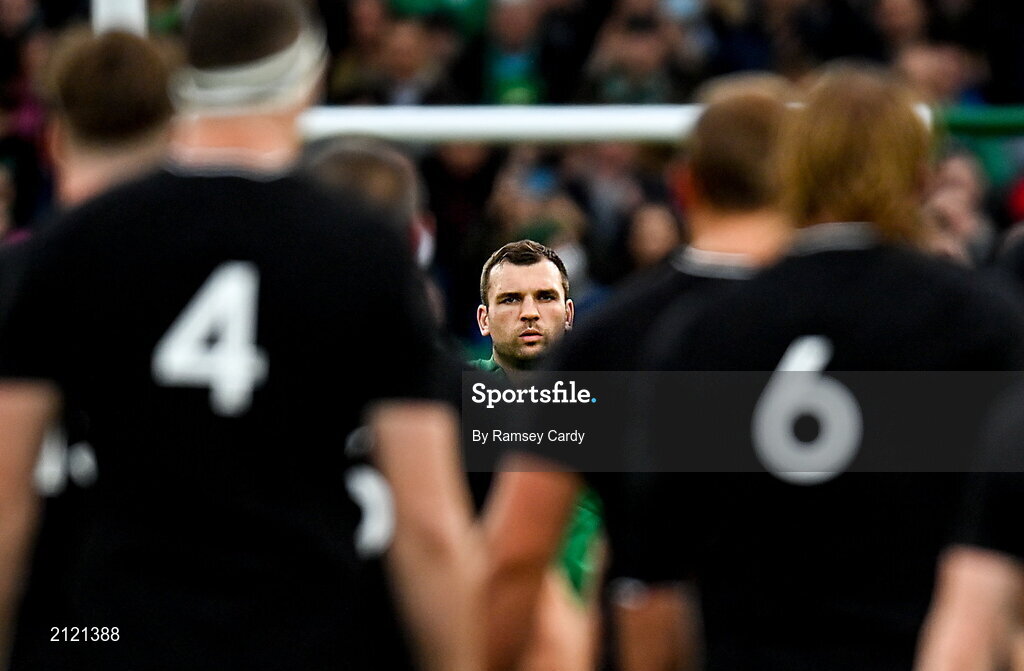 13 November 2021; Tadhg Beirne of Ireland watches New Zealand players perform the Haka before the Autumn Nations Series match between Ireland and New Zealand at Aviva Stadium in Dublin. Photo by Ramsey Cardy/Sportsfile