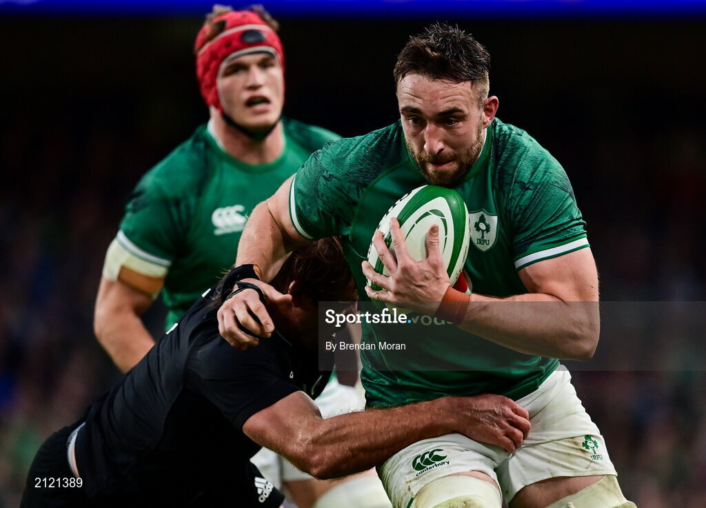 13 November 2021; Jack Conan of Ireland is tackled by Ethan Blackadder of New Zealand during the Autumn Nations Series match between Ireland and New Zealand at Aviva Stadium in Dublin. Photo by Brendan Moran/Sportsfile