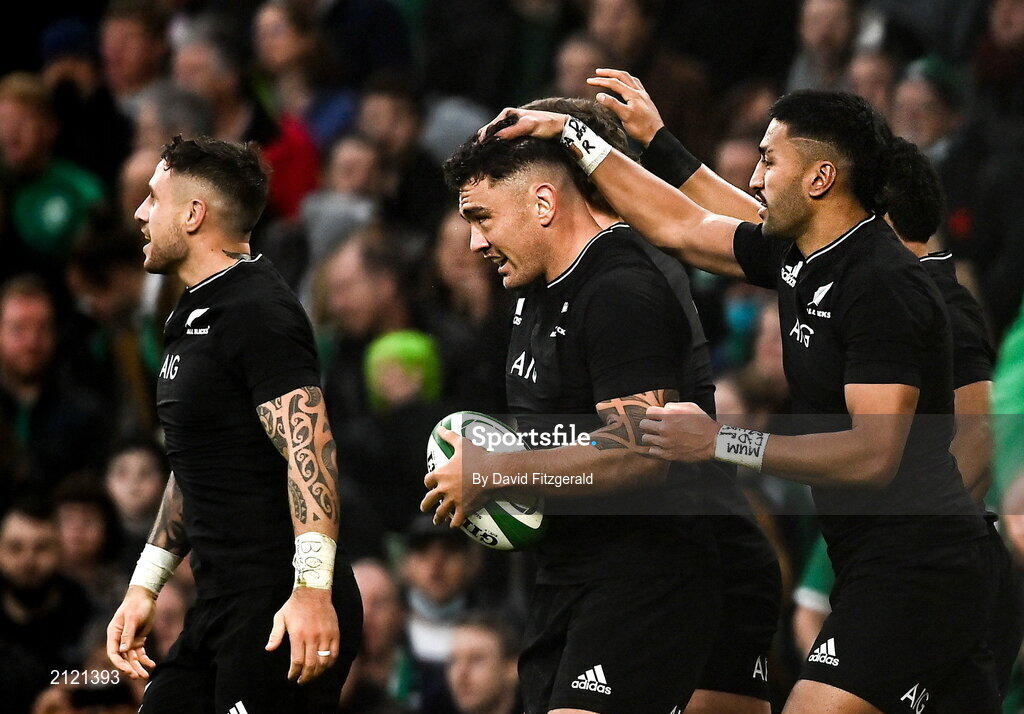 13 November 2021; Codie Taylor of New Zealand, centre, celebrates with team-mates including Rieko Ioane, right, after scoring his side's first try during the Autumn Nations Series match between Ireland and New Zealand at Aviva Stadium in Dublin. Photo by David Fitzgerald/Sportsfile