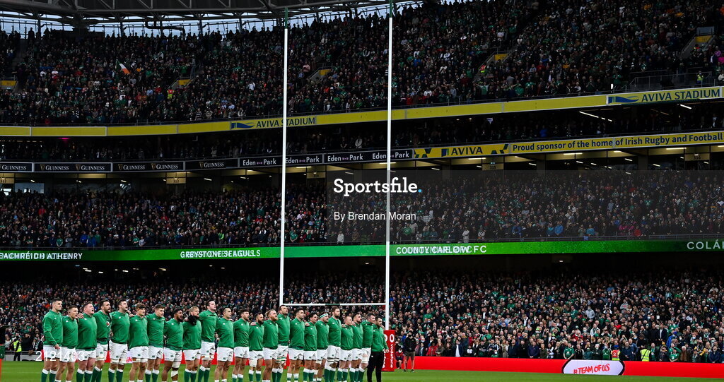 13 November 2021; Ireland players lineup before the Autumn Nations Series match between Ireland and New Zealand at Aviva Stadium in Dublin. Photo by Brendan Moran/Sportsfile