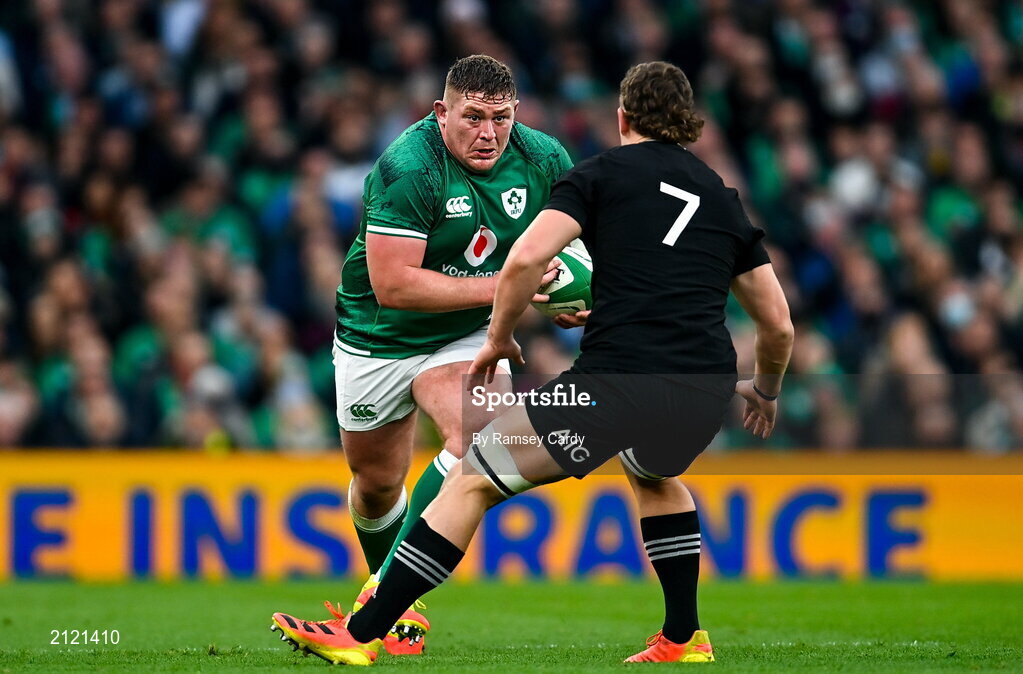 13 November 2021; Tadhg Furlong of Ireland in action against Dalton Papalii of New Zealand during the Autumn Nations Series match between Ireland and New Zealand at Aviva Stadium in Dublin. Photo by Ramsey Cardy/Sportsfile