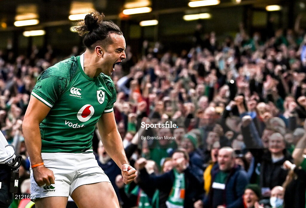 13 November 2021; James Lowe of Ireland celebrates after scoring his side's first try during the Autumn Nations Series match between Ireland and New Zealand at Aviva Stadium in Dublin. Photo by Brendan Moran/Sportsfile