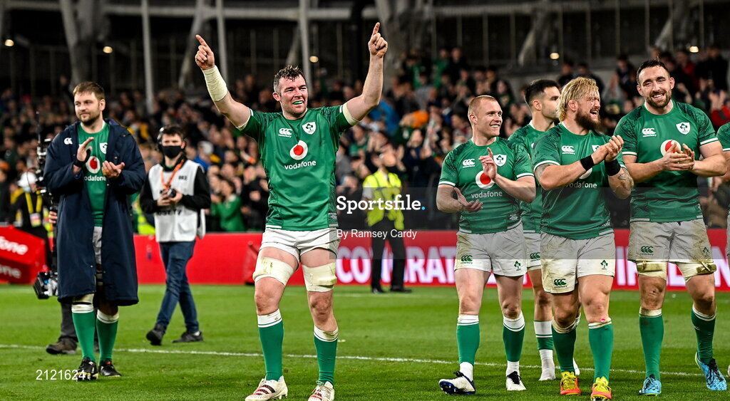 13 November 2021; Peter O’Mahony of Ireland, centre, celebrates alongside team-mates Keith Earls, Andrew Porter and Jack Conan after their side's victory during the Autumn Nations Series match between Ireland and New Zealand at Aviva Stadium in Dublin. Photo by Ramsey Cardy/Sportsfile