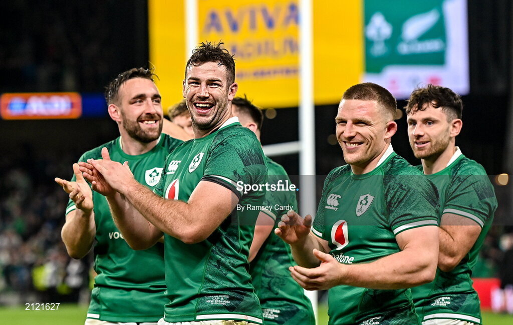 13 November 2021; Ireland players, from left, Jack Conan, Caelan Doris, Andrew Conway and Hugo Keenan after their side's victory during the Autumn Nations Series match between Ireland and New Zealand at Aviva Stadium in Dublin. Photo by Ramsey Cardy/Sportsfile