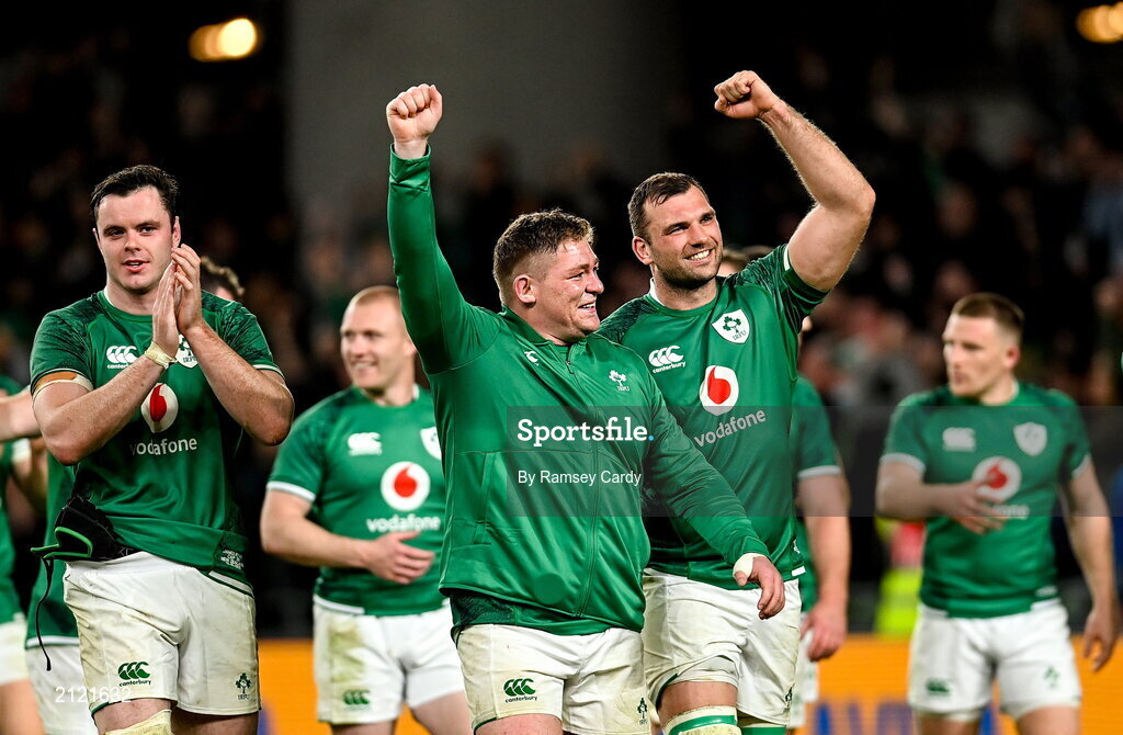 13 November 2021; Ireland players, from left, James Ryan, Tadhg Furlong and Tadhg Beirne celebrate after their side's victory during the Autumn Nations Series match between Ireland and New Zealand at Aviva Stadium in Dublin. Photo by Ramsey Cardy/Sportsfile