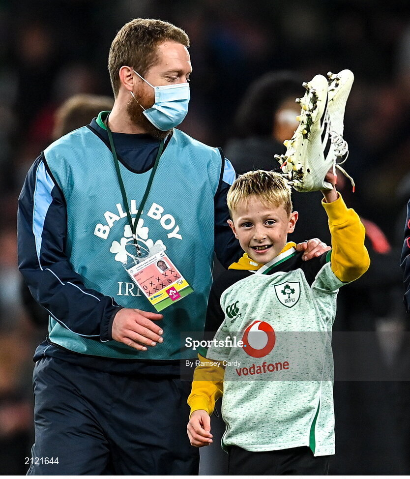 13 November 2021; A young Ireland supporter is escorted off the field with Conor Murray's boots after the Autumn Nations Series match between Ireland and New Zealand at Aviva Stadium in Dublin. Photo by Ramsey Cardy/Sportsfile