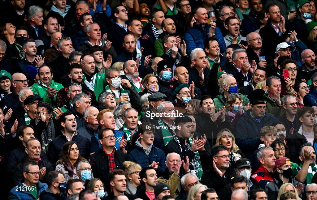 13 November 2021; Supporters look on during the Autumn Nations Series match between Ireland and New Zealand at Aviva Stadium in Dublin. Photo by Ramsey Cardy/Sportsfile