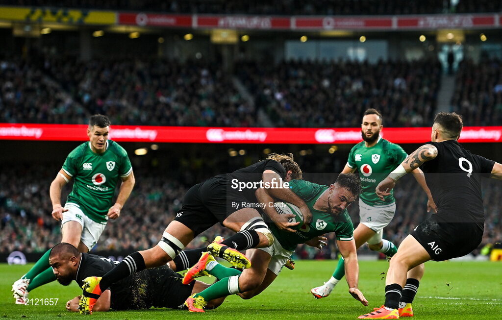13 November 2021; Rónan Kelleher of Ireland is tackled by Ethan Blackadder of New Zealand during the Autumn Nations Series match between Ireland and New Zealand at Aviva Stadium in Dublin. Photo by Ramsey Cardy/Sportsfile