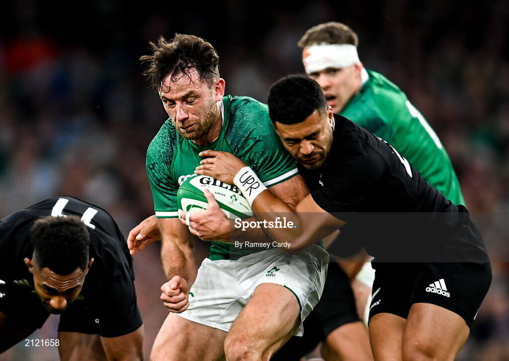 13 November 2021; Hugo Keenan of Ireland is tackled by Richie Mo'unga of New Zealand during the Autumn Nations Series match between Ireland and New Zealand at Aviva Stadium in Dublin. Photo by Ramsey Cardy/Sportsfile
