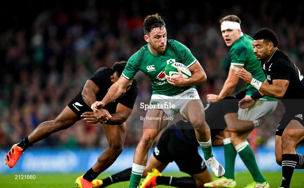 13 November 2021; Hugo Keenan of Ireland is tackled by Sevu Reece, left and David Havili of New Zealand during the Autumn Nations Series match between Ireland and New Zealand at Aviva Stadium in Dublin. Photo by Ramsey Cardy/Sportsfile