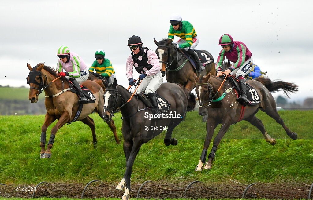 14 November 2021; Mr Diablo, centre, with Donagh Meyler up, and Michael's Pick, right, with Conor Orr up, jump Ruby's Double during the Pigsback.com Risk Of Thunder Steeplechase on day two of the Punchestown Winter Festival at Punchestown Racecourse in Kildare. Photo by Seb Daly/Sportsfile