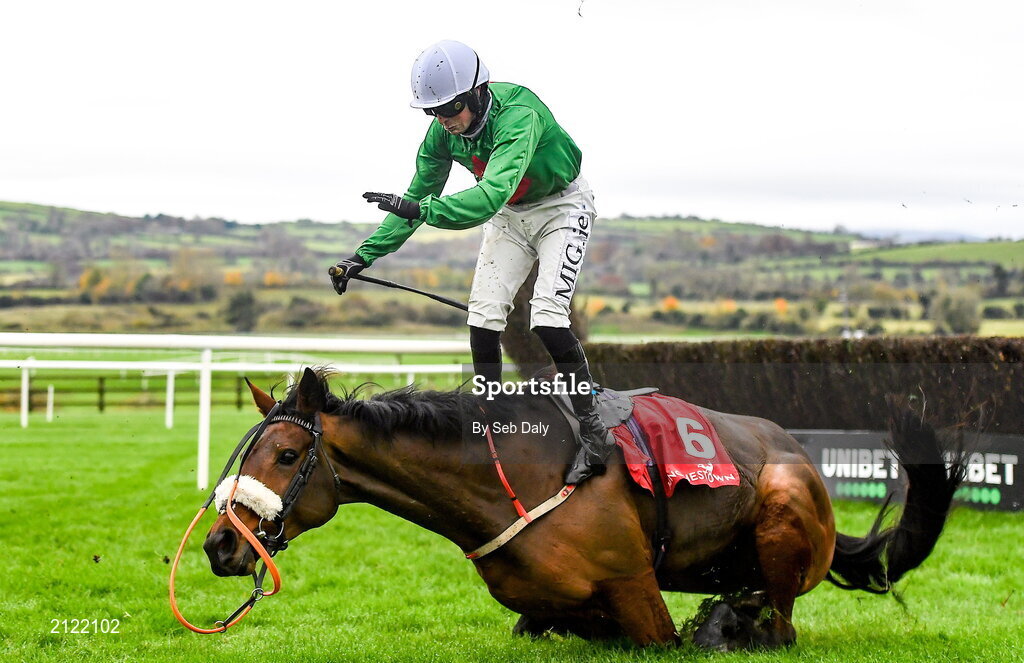 14 November 2021; Ballyshannon Rose and jockey Donal McInerney fall at the last during the Liam & Valerie Brennan Florida Pearl Novice Steeplechase on day two of the Punchestown Winter Festival at Punchestown Racecourse in Kildare. Photo by Seb Daly/Sportsfile