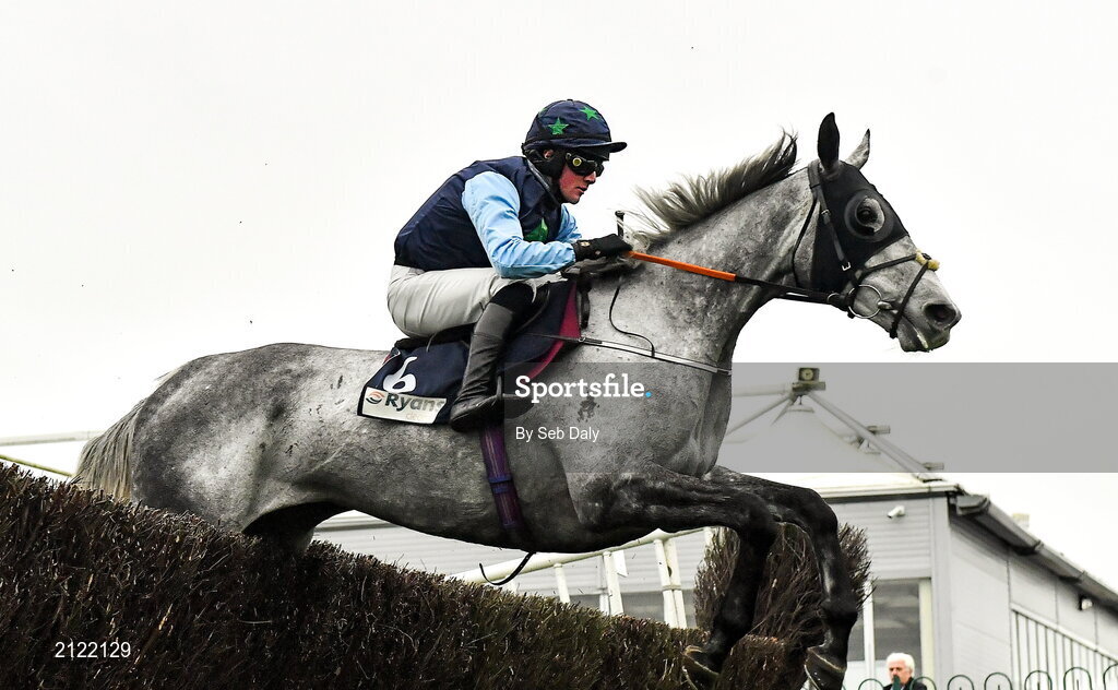 14 November 2021; Fully Charged, with Hugh Morgan up, jumps the last during the first circuit on their way to winning the Ryans Cleaning Handicap Steeplechase on day two of the Punchestown Winter Festival at Punchestown Racecourse in Kildare. Photo by Seb Daly/Sportsfile