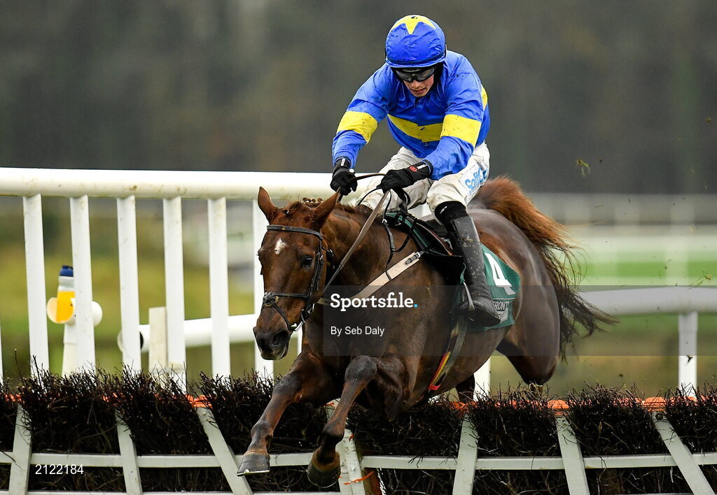 14 November 2021; Dysart Diamond, with Bryan Cooper up, jumps the last on their way to winning the Frontline Security Grabel Mares Hurdle during day two of the Punchestown Winter Festival at Punchestown Racecourse in Kildare. Photo by Seb Daly/Sportsfile