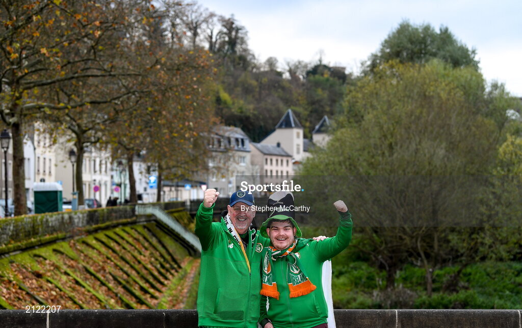 14 November 2021; Liam Butler, from Blackrock, Cork, left and Patrick Flaherty, from Galway City, before the FIFA World Cup 2022 qualifying group A match between Luxembourg and Republic of Ireland at Stade de Luxembourg in Luxembourg. Photo by Stephen McCarthy/Sportsfile