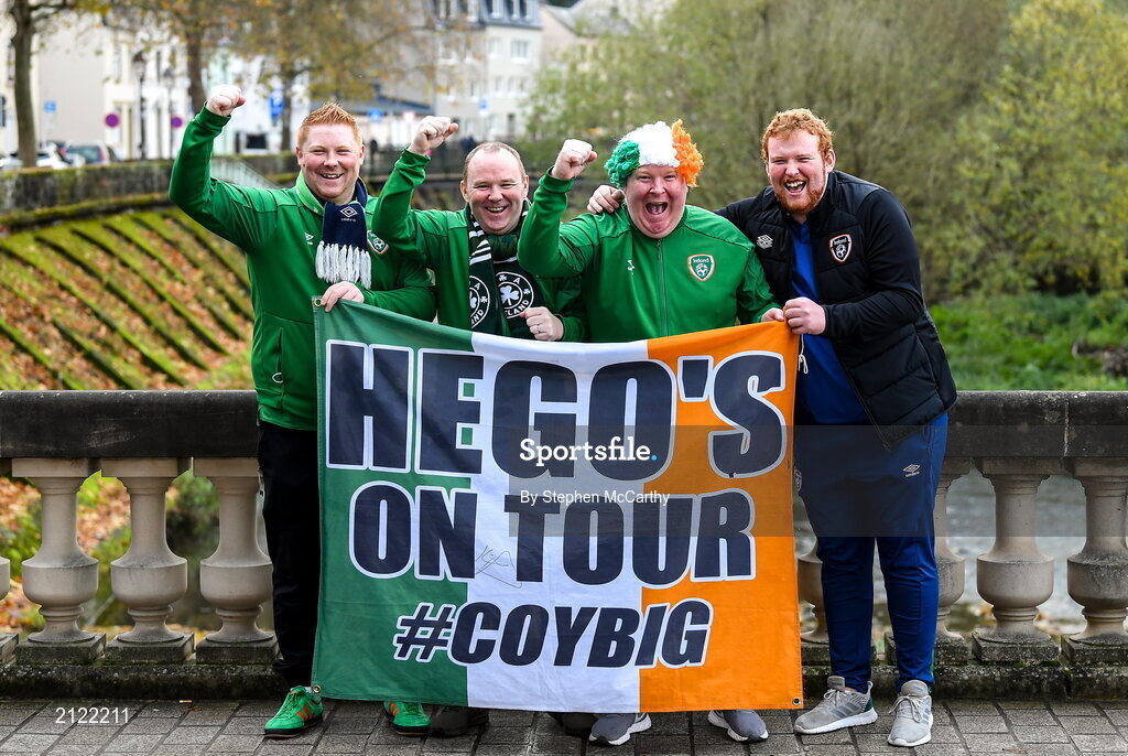 14 November 2021; Members of the Hegarty family, all part of the Wexford Supporters Club, from left, Sean, Robbie, Patrick and Ryan, before the FIFA World Cup 2022 qualifying group A match between Luxembourg and Republic of Ireland at Stade de Luxembourg in Luxembourg. Photo by Stephen McCarthy/Sportsfile