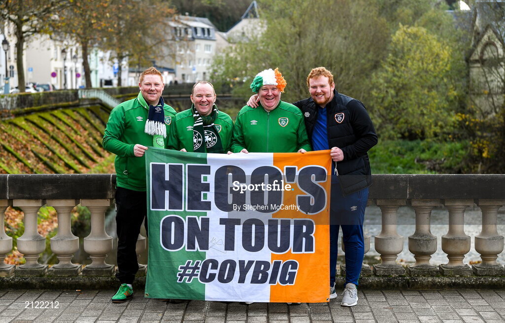 14 November 2021; Members of the Hegarty family, all part of the Wexford Supporters Club, from left, Sean, Robbie, Patrick and Ryan, before the FIFA World Cup 2022 qualifying group A match between Luxembourg and Republic of Ireland at Stade de Luxembourg in Luxembourg. Photo by Stephen McCarthy/Sportsfile