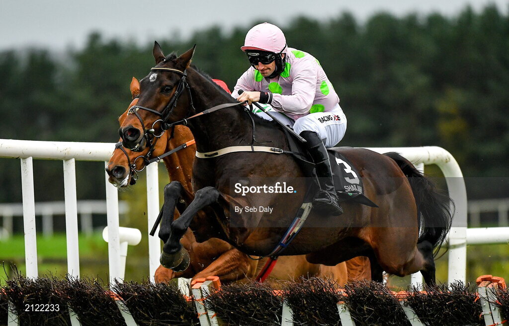 14 November 2021; Sharjah, with Patrick Mullins up, jumps the last on their way to winning the Unibet Morgiana Hurdle during day two of the Punchestown Winter Festival at Punchestown Racecourse in Kildare. Photo by Seb Daly/Sportsfile